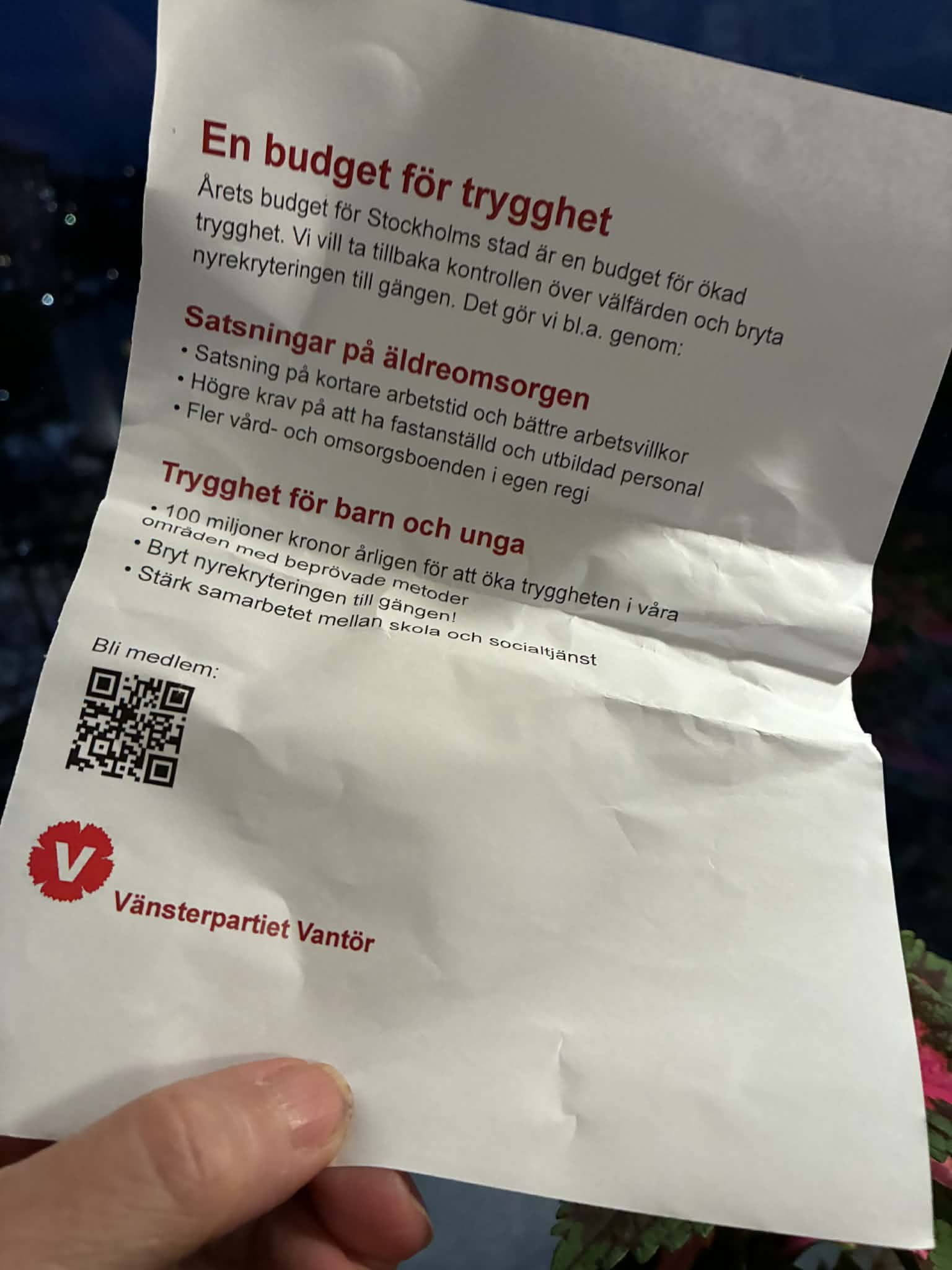 Alltid roligt också att få höra ”ni har min röst” när vi är ute och delar flygblad, och att träffa medlemmar liksom vänner och bekanta som blir glada för att vi kommer till just deras stadsdel.