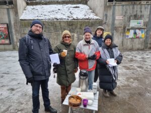 En del kommer fram till oss för att även få en kopp värmande kaffe, och kaka till. Roligt att kunna bjuda, och det värmer i snålblåsten att vi har många Högdalsbor på vår sida. Fint också att vi som en del av den rödgröna majoriteten i staden kan visa hur vi är med och bygger ett bättre Vantör. Flera nya idrottshallar, och inte minst många fler arbetsplatser då stadsdelsförvaltningen flyttar till Rågsved från 2027.