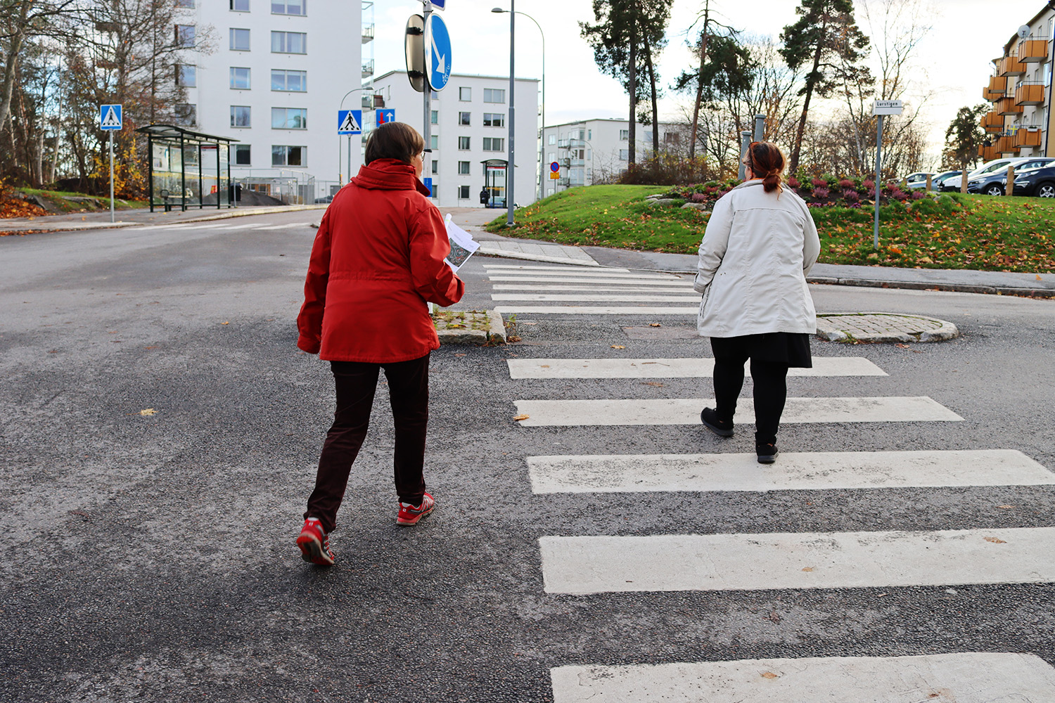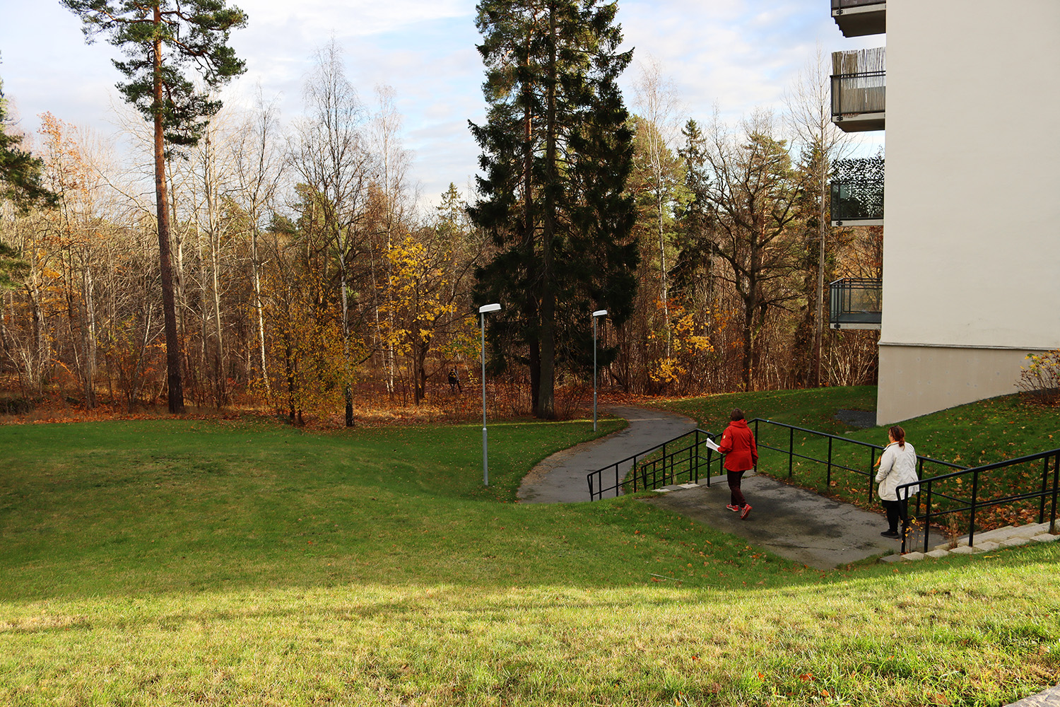 Vänsterpartister i Rågsved går runt för att titta på platserna där bostadsbebyggelse planeras. Här på Bjursätragatan nära Familjebostäders Stockholmshus. Foto: Malin Furöstam.