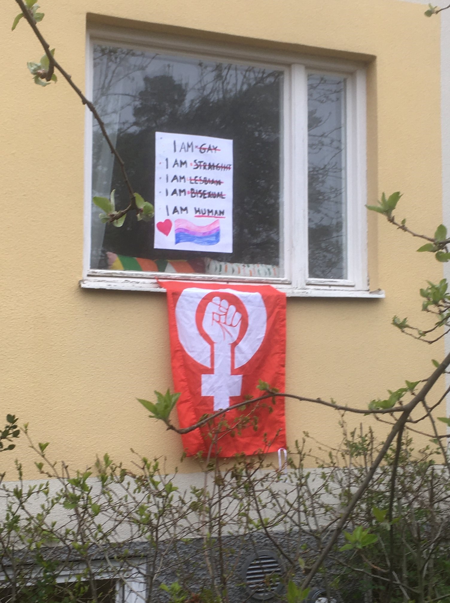 Så mycket har ändrats eller tagits bort detta år. Det blev inget fysiskt 1:a majtåg, det kändes kan jag lova. Jag har gått i stort varje år sedan 1979, så det kändes tomt. Även om det fanns ett digitalt alternativ och vi visade våra tankar i dekorerade fönster runt om i staden (mitt och dotterns på bilderna).
