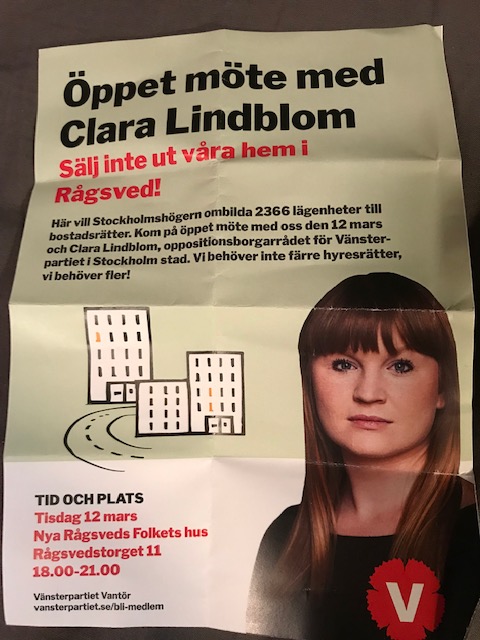 Vänsterpartiet Vantör har alltid varit tydligt med vad vi vill. Vi tar fram lokala valprogram som visar var vi står och vilka politiska frågor som vi vill driva efter varje val. När det gäller bostadspolitik skrev vi i vårt program för Ett rödare och grönare Vantör att vi vill bygga mer allmännyttiga hyresrätter i hela Vantör. Självklarheter som att vi inte står bakom ombildningar av allmännyttiga hyresrätter till bostadsrätter skrev vi däremot inte om, det är nog väl känt att Vänsterpartiet är det parti som starkast är emot privatiseringar och utförsäljningar.