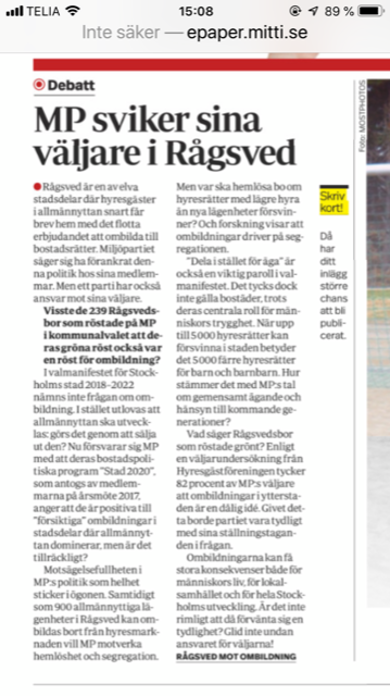 Samma tydlighet präglar inte Miljöpartiet, vilket framgår av ovanstående insändare i Mittisöderort från nätverket Rågsved mot ombildning. Det ska bli intressant att se hur partiet svarar nätverket och sina väljare i Rågsved, där vi inte mött en enda hyresgäst i allmännyttan som röstat på Miljöpartist som försvarar ombildningarna. Vi anser i likhet med nätverket att det hade varit på sin plats att partiet klargjort sin inställning till ombildningar, inte bara i sina medlemsprogram utan framförallt i sina valprogram.