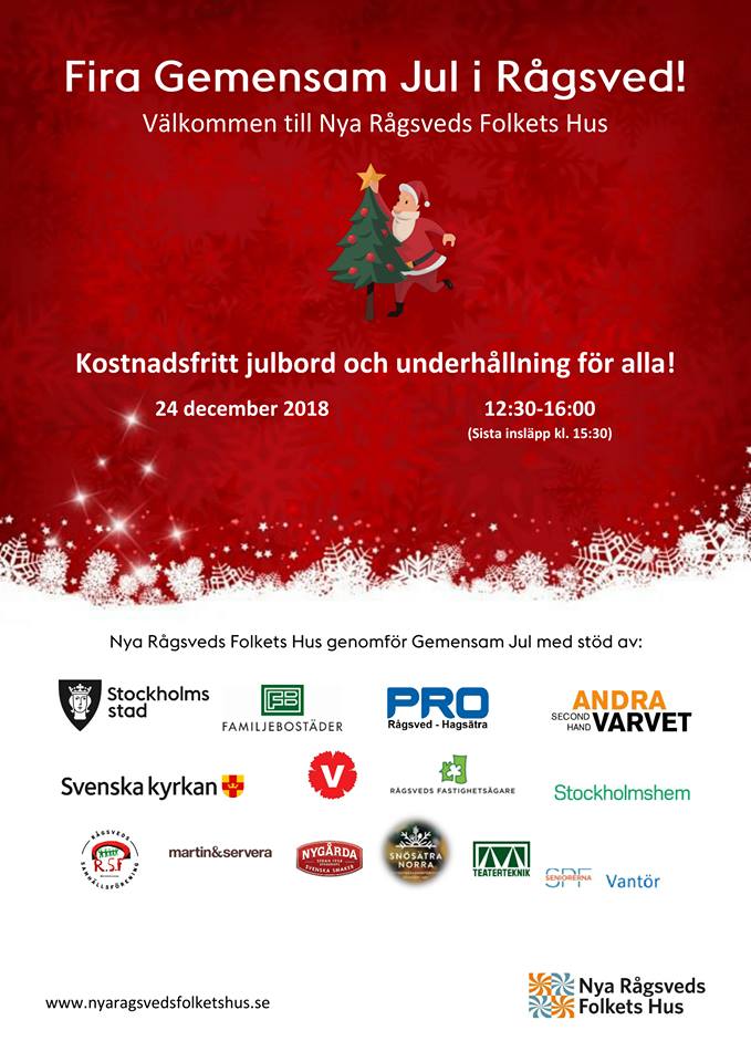 Vill du fira en icke-kommersiell jul? Ja då är du välkommen till Rågsveds Folkets Hus på julafton. Maten, stämningen och gemenskapen är väldigt uppskattad av gäster, som i många fall kommer tillbaka år från år. Alla är välkomna, tillsammans firar vi en fin julafton!