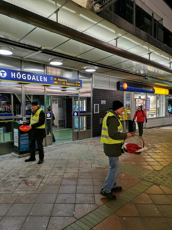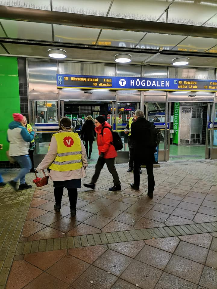 På Lucia möttes Högdalsborna av ett morgonpiggt gäng vänsterpartister som bjöd på V-märkta pepparkakor samt politisk agitation för nolltaxa i kollektivtrafiken.